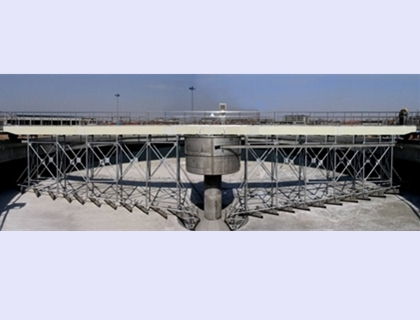 主梁在驱动装置带动下,绕池中心轴线旋转,将沉积在池底的污泥由刮泥板刮集至各吸泥口,在液位的作用下,污泥经吸泥口,输泥槽,虹吸管,中心泥罐,中心排泥管排至污泥坑。每个吸泥管上端设有调节器,以调节各吸管的流量分配。同时,液面上的浮渣向随主梁旋转的撇渣板和周边挡渣堰形成的渐缩区域内集中,直至其封闭边——刮渣摆臂。当摆臂抵达集渣斗时,由摆臂上的刮渣板刮集至集渣斗池外。